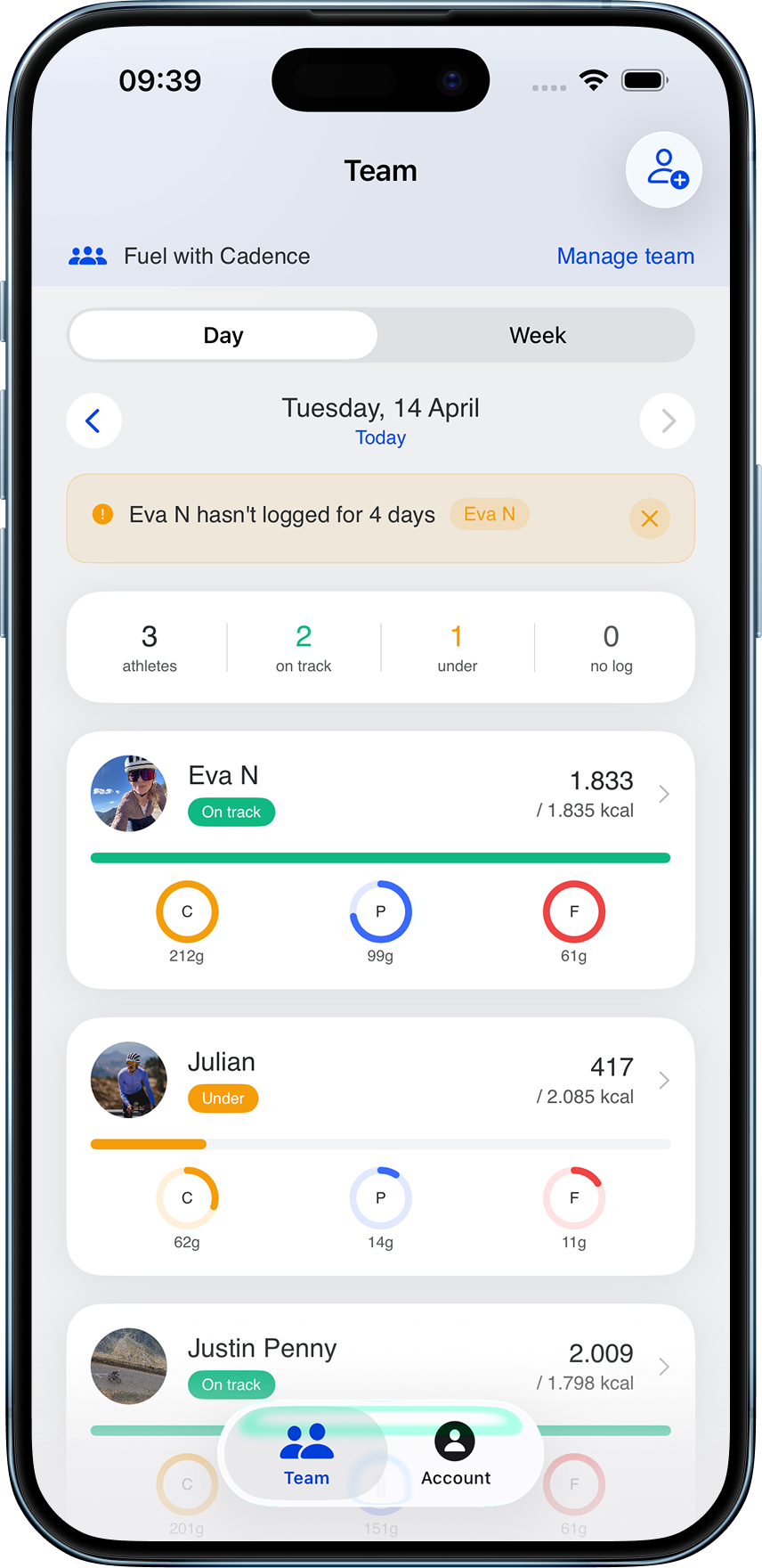 Cadence Fuel gives you real-time nutrition visibility across every athlete you work with — on your phone or in the web dashboard.